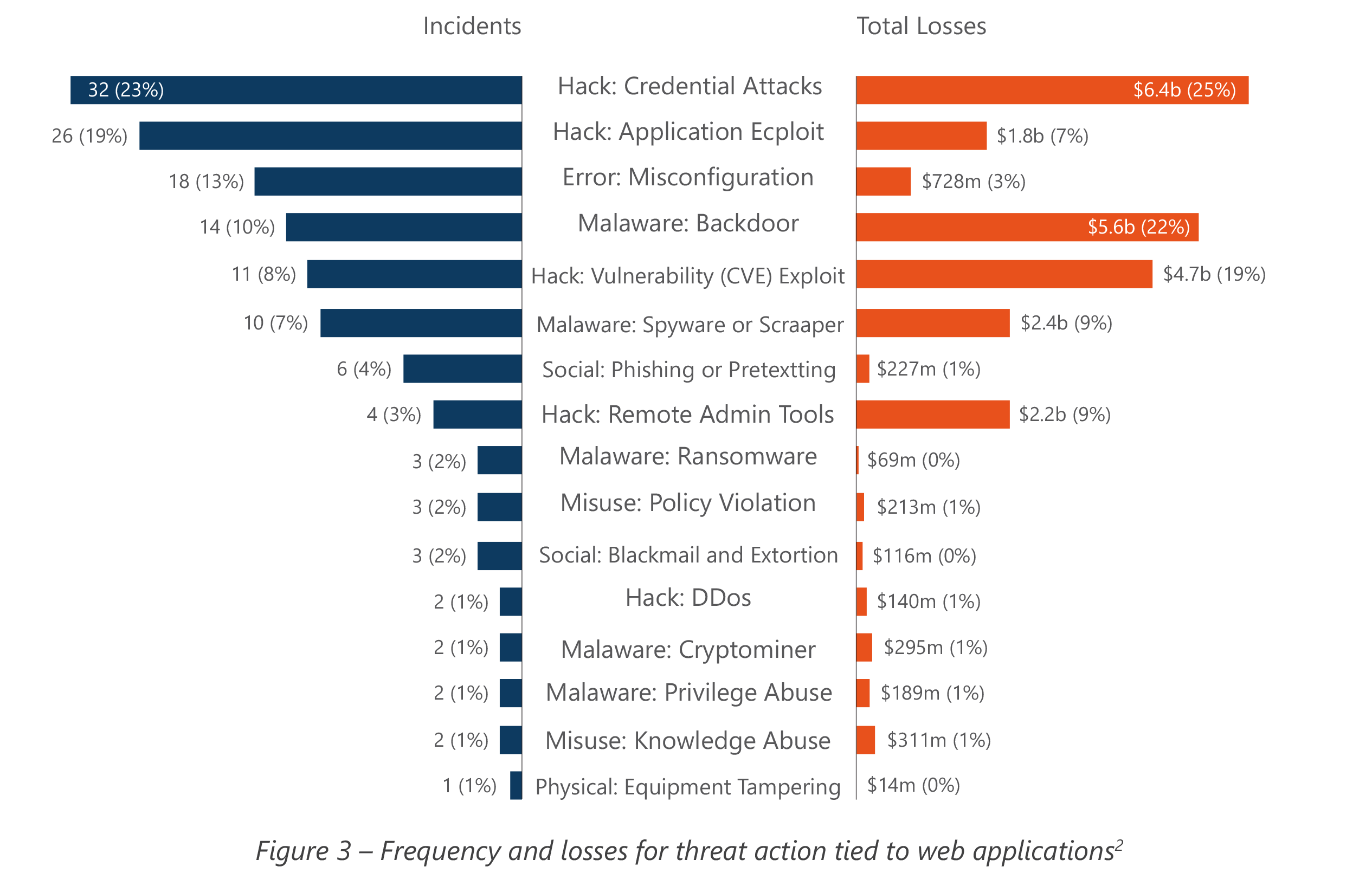 - 58 of the 103 biggest incidents over the last 5 years (56%) tie back to some form of web application security issue. With an all-inclusive price tag of $7.6 billion and some change, this constitutes 42% of all financial losses recorded for these extreme events.